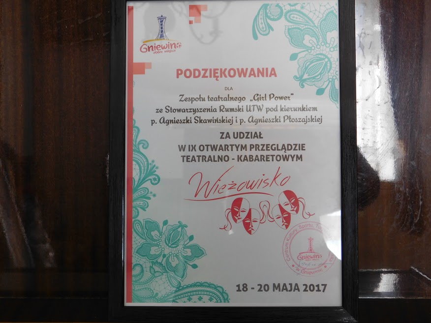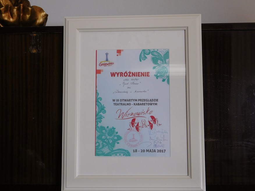 Zespół z przedstawieniem wystąpił na przeglądzie zespołów teatralnych w Gniewinie, gdzie otrzymał wyróżnienie. Gratulujemy.